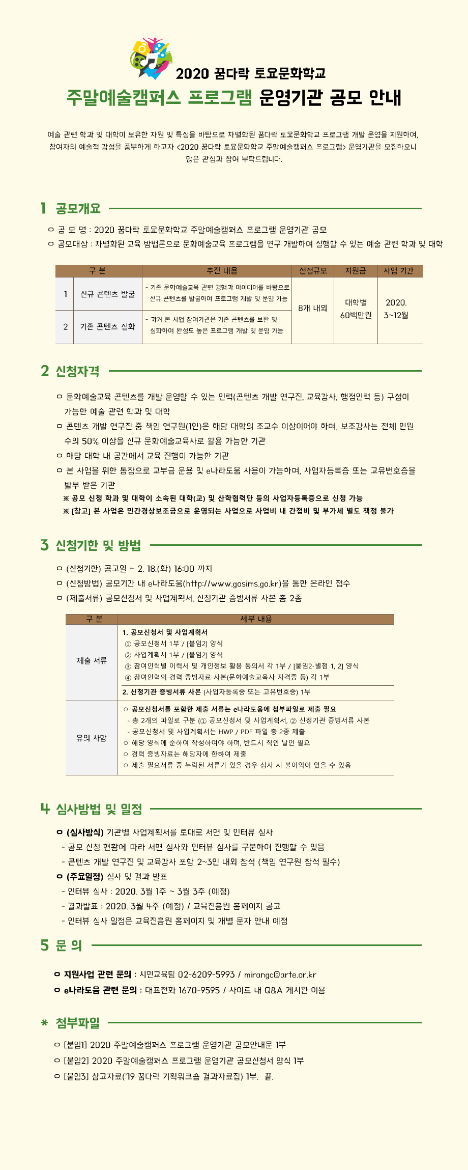 - [한국문화예술교육진흥원] 2020 꿈다락 토요문화학교 주말예술캠퍼스 프로그램 운영기관 공모