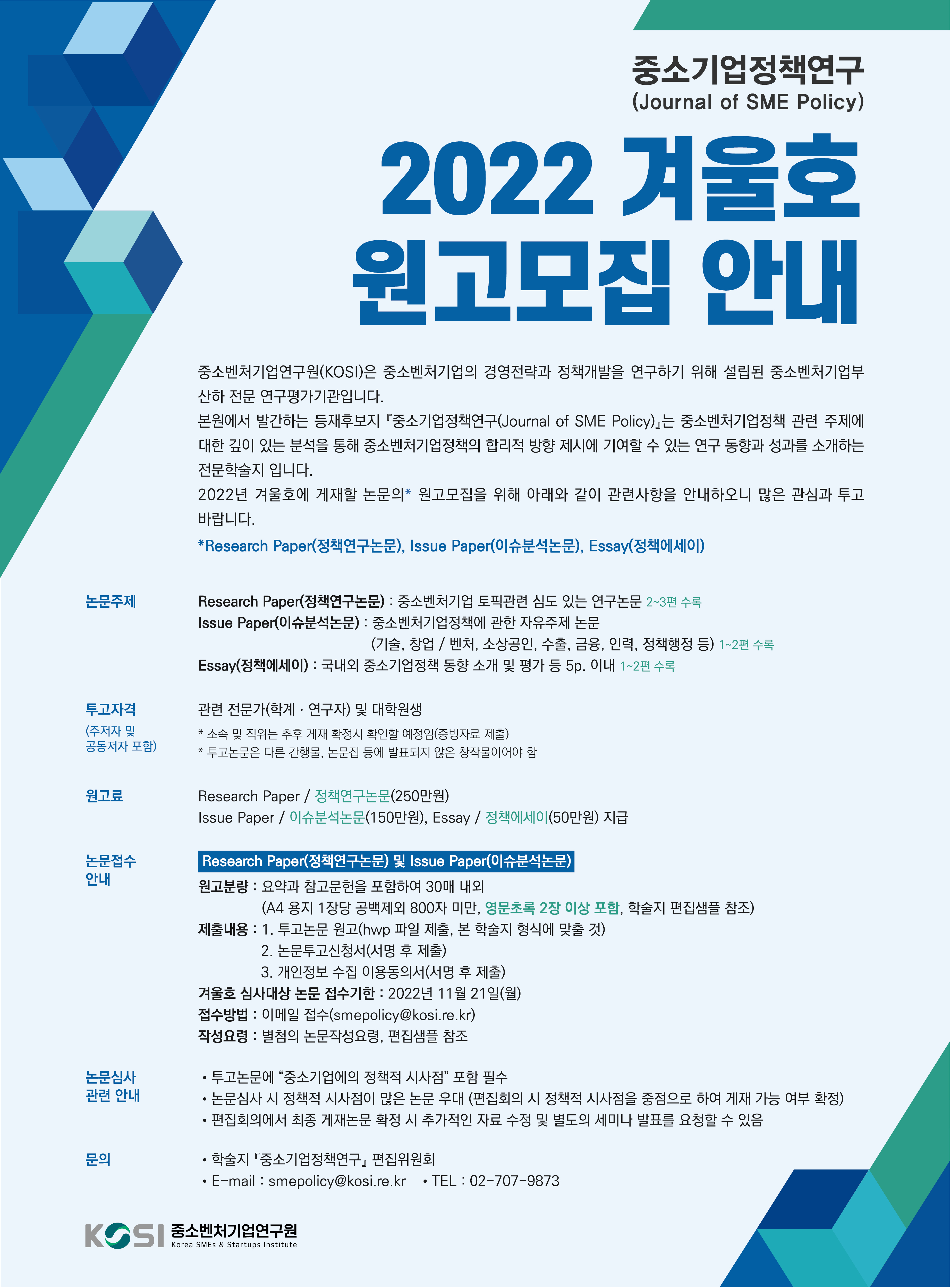 - [일반공지] [중소벤처기업연구원] 등재후보지 중소기업정책연구(Journal of SME Policy) 2022년 겨울호 원고 모집 안내