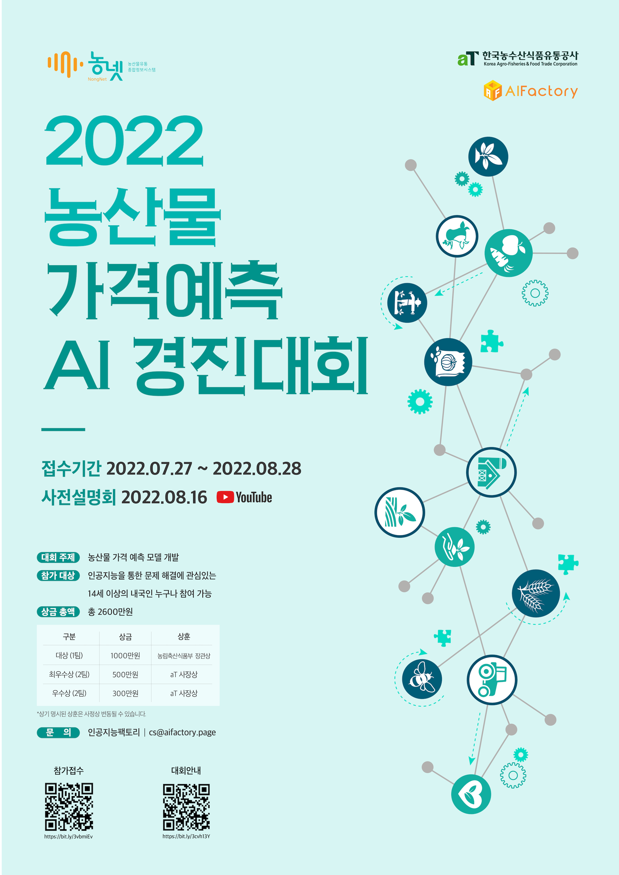 - [(주)인공지능팩토리] 2022 농넷 농산물 가격 예측 A I 경진대회 개최 안내