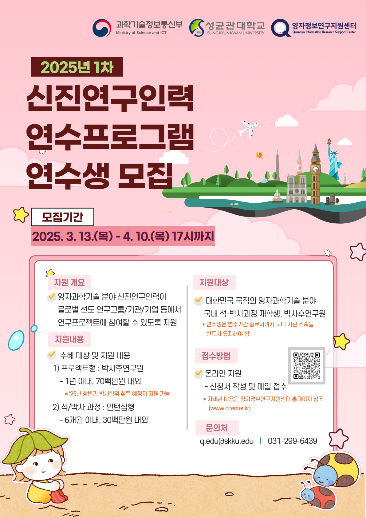 - [기타] [전체대학원] 성균관대학교 양자정보연구지원센터 '25년 1차 신진연구인력 연수프로그램' 연수생 모집 홍보