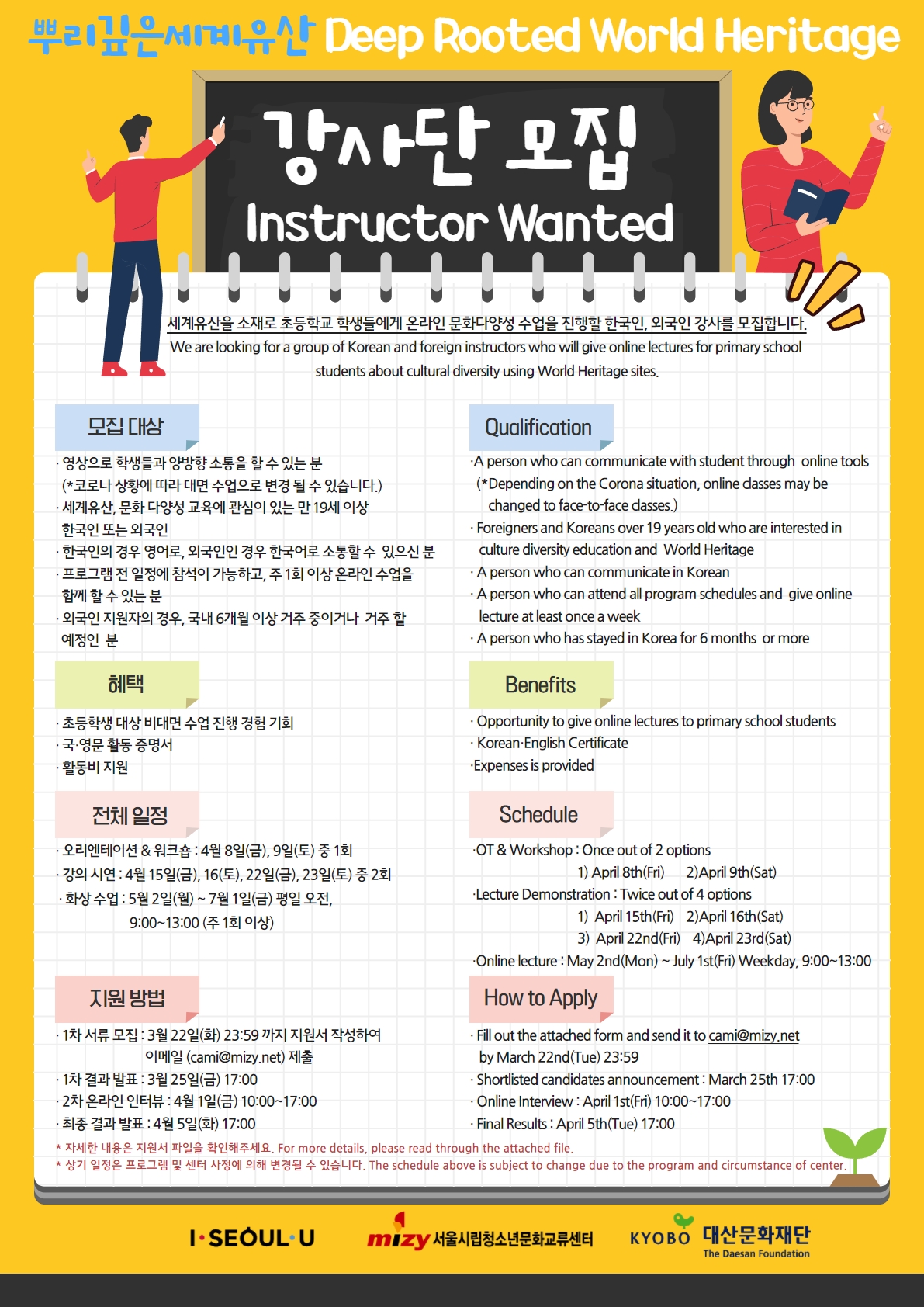 - [서울시립청소년문화교류센터] '뿌리깊은세계유산' 한국인 및 외국인 강사 모집 안내